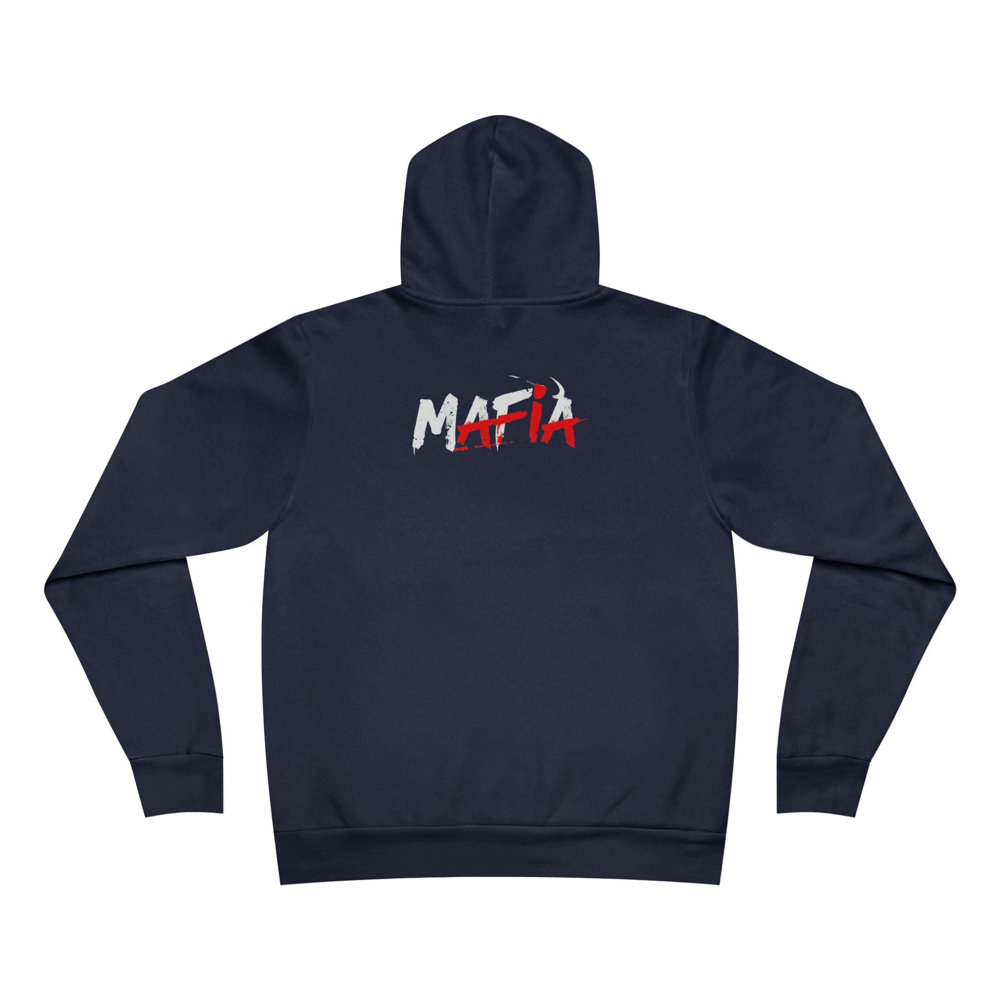 This black sponge fleece pullover brings street-ready attitude and hometown pride together. Soft yet substantial midweight fleece cups the body, while a roomy hood with white drawstrings and a kangaroo pouch keep you warm on late-night runs or coffee shop hangs. The front displays a bold, hand-lettered “716” in distressed red and white, and the back carries a raw, graffiti-style “MAFIA” mark—both graphics read like a local crew tag, channeling neighborhood loyalty and low-key rebellion. The retail fit and ribbed cuffs/waistband hold shape through repeat wear. Wear it when you want comfort with edge: winter walks, watching the game, or rolling through familiar streets with friends.