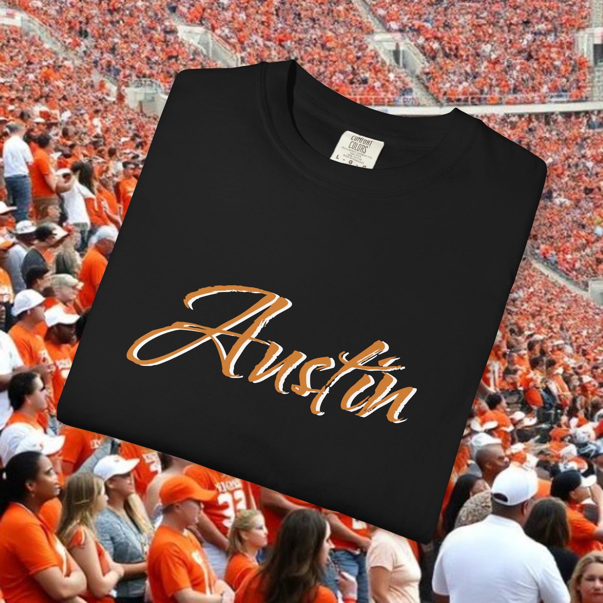 Austin Fan T-Shirt, Soft-style, front and back graphic. Stylish and fashionable tailgate attire.