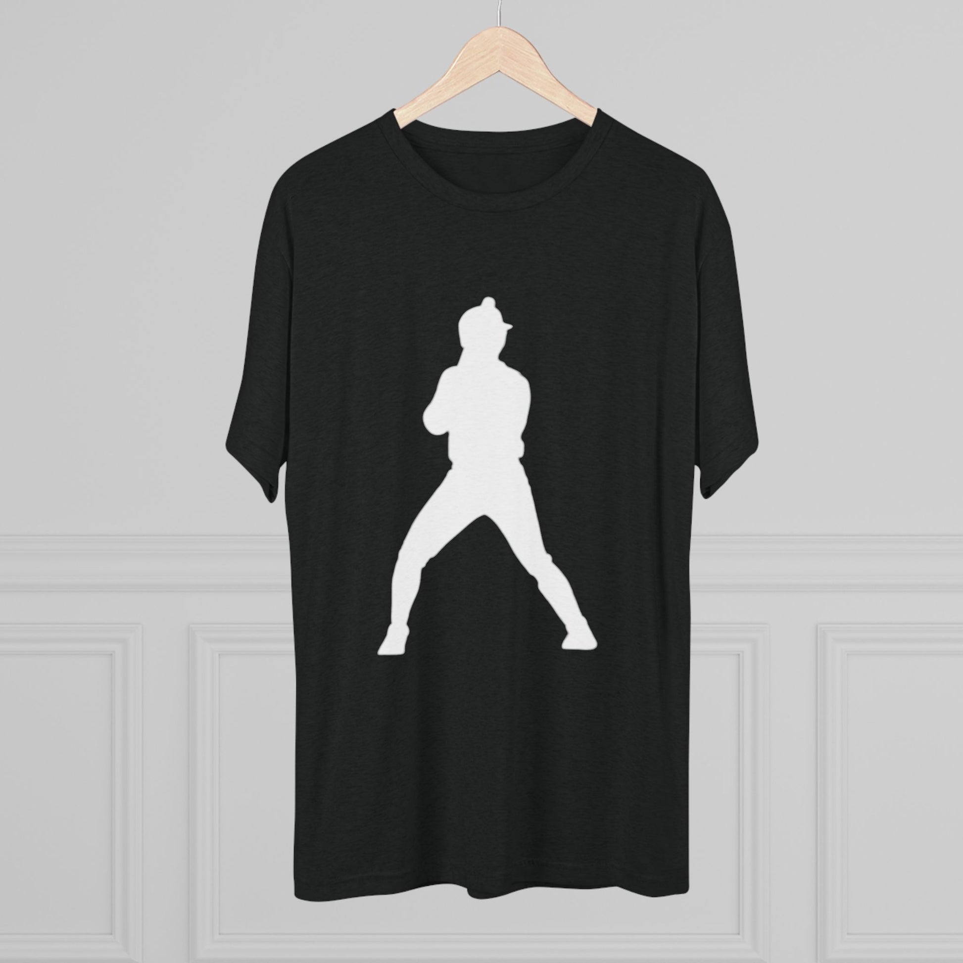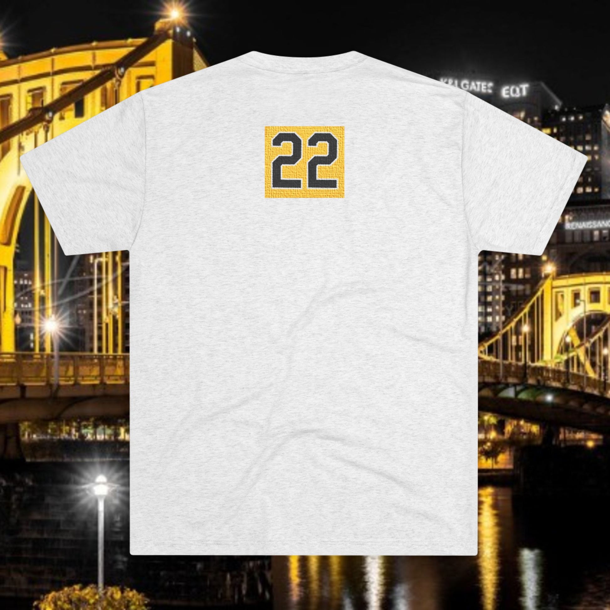 A lightweight, tri-blend crew tee designed for everyday wear with a quiet, sports-inspired edge. The front features a bold silhouette of a poised athlete in mid-stance, while the back shows a clean, vintage-style number “22” framed in team colors. The fabric drapes softly against the body and keeps its shape thanks to side seams, shoulder tape, and a ribbed knit collar. Wear it layered under a jacket for city nights or alone on warm-days when you want a nod to hometown teams and street-level pride. The subtle athletic graphic reads familiar without shouting — comfort and understated confidence in one tee.