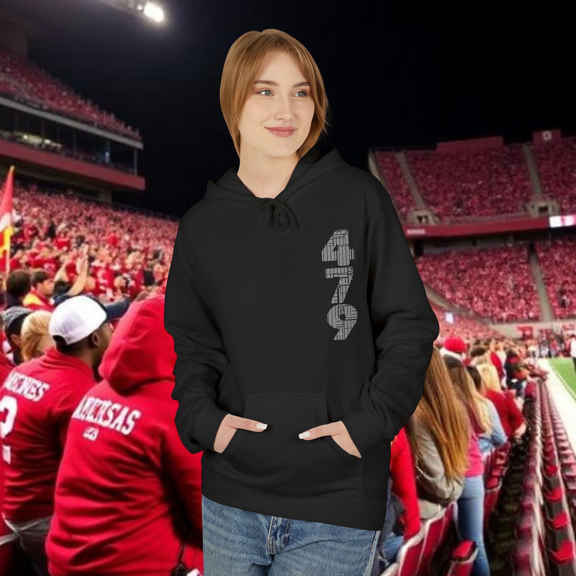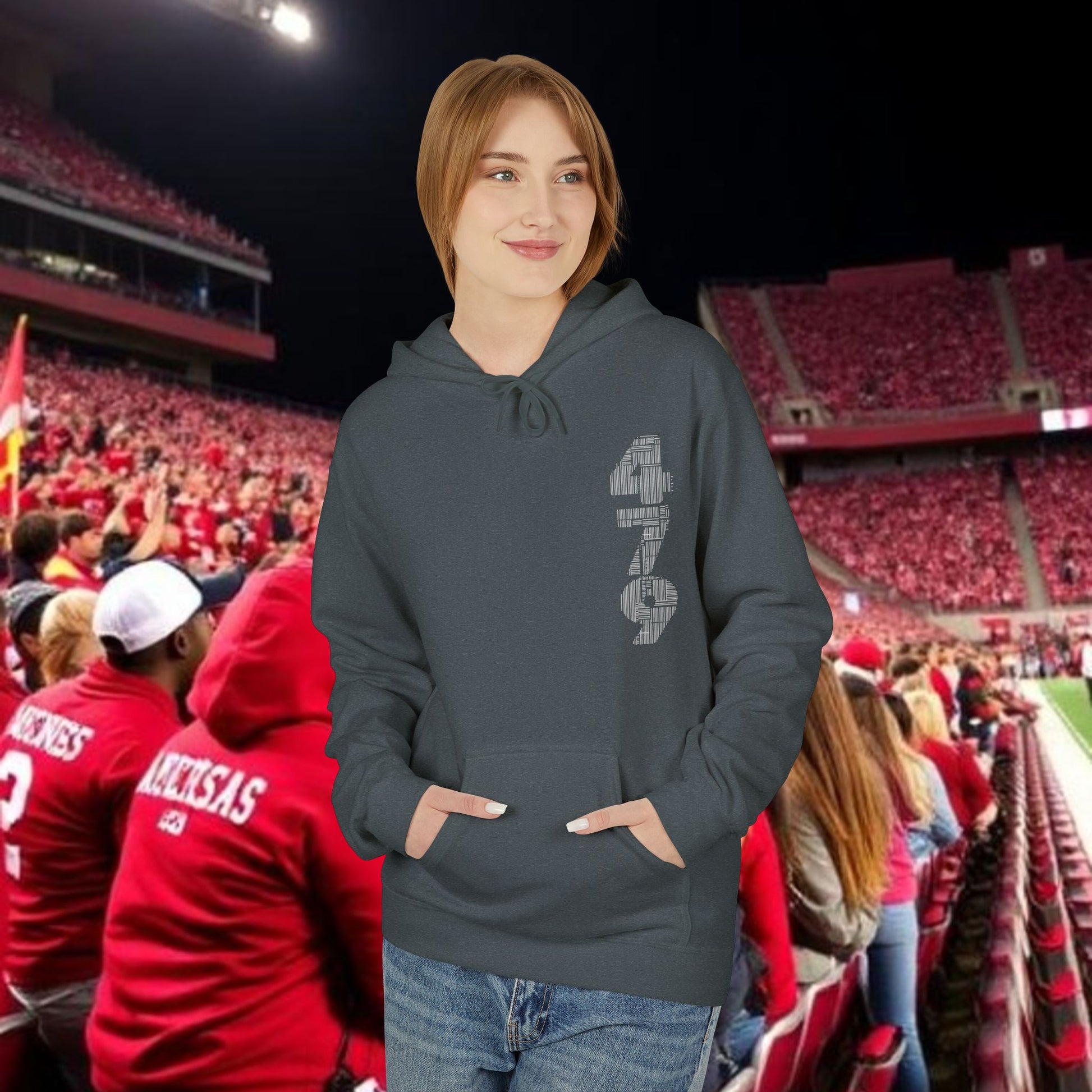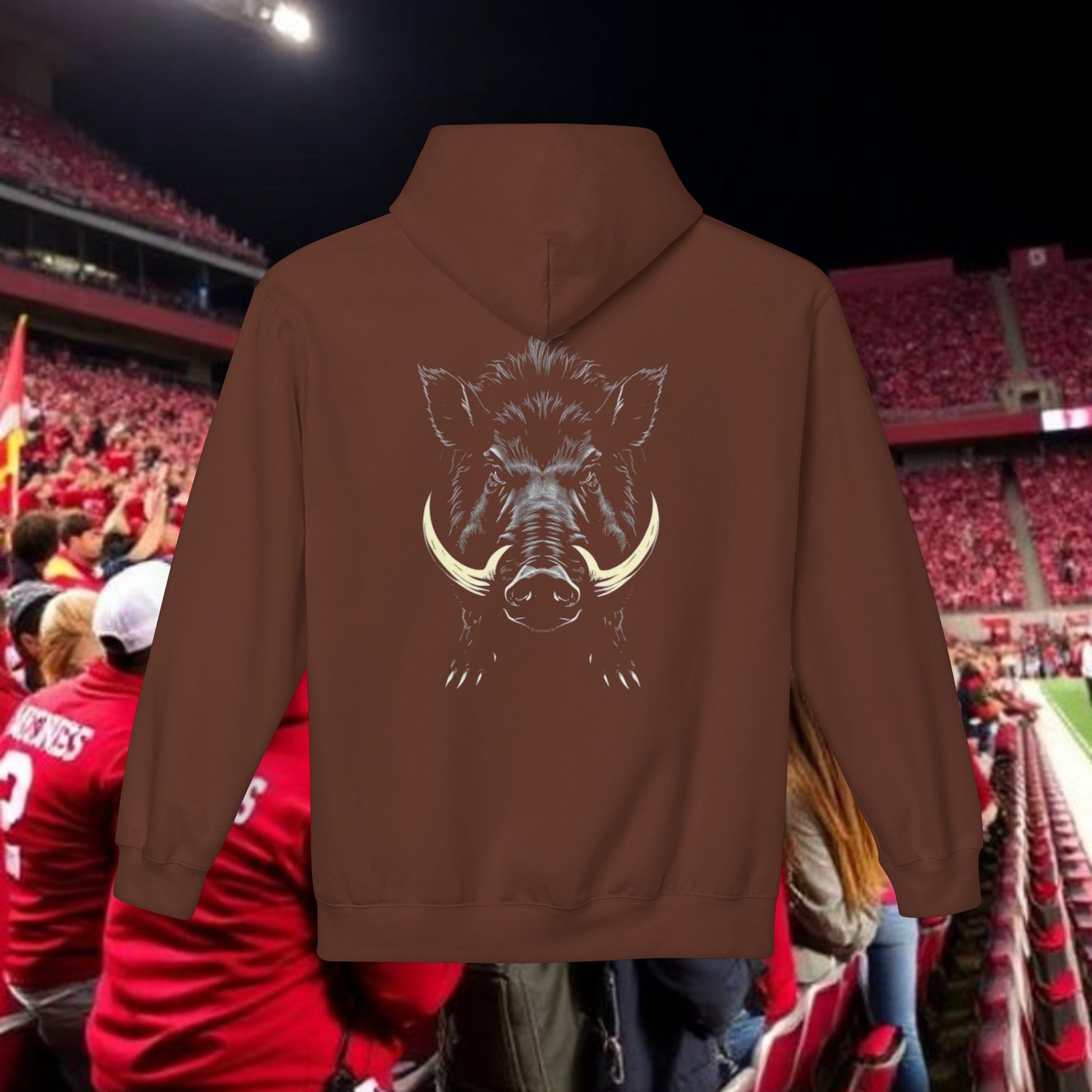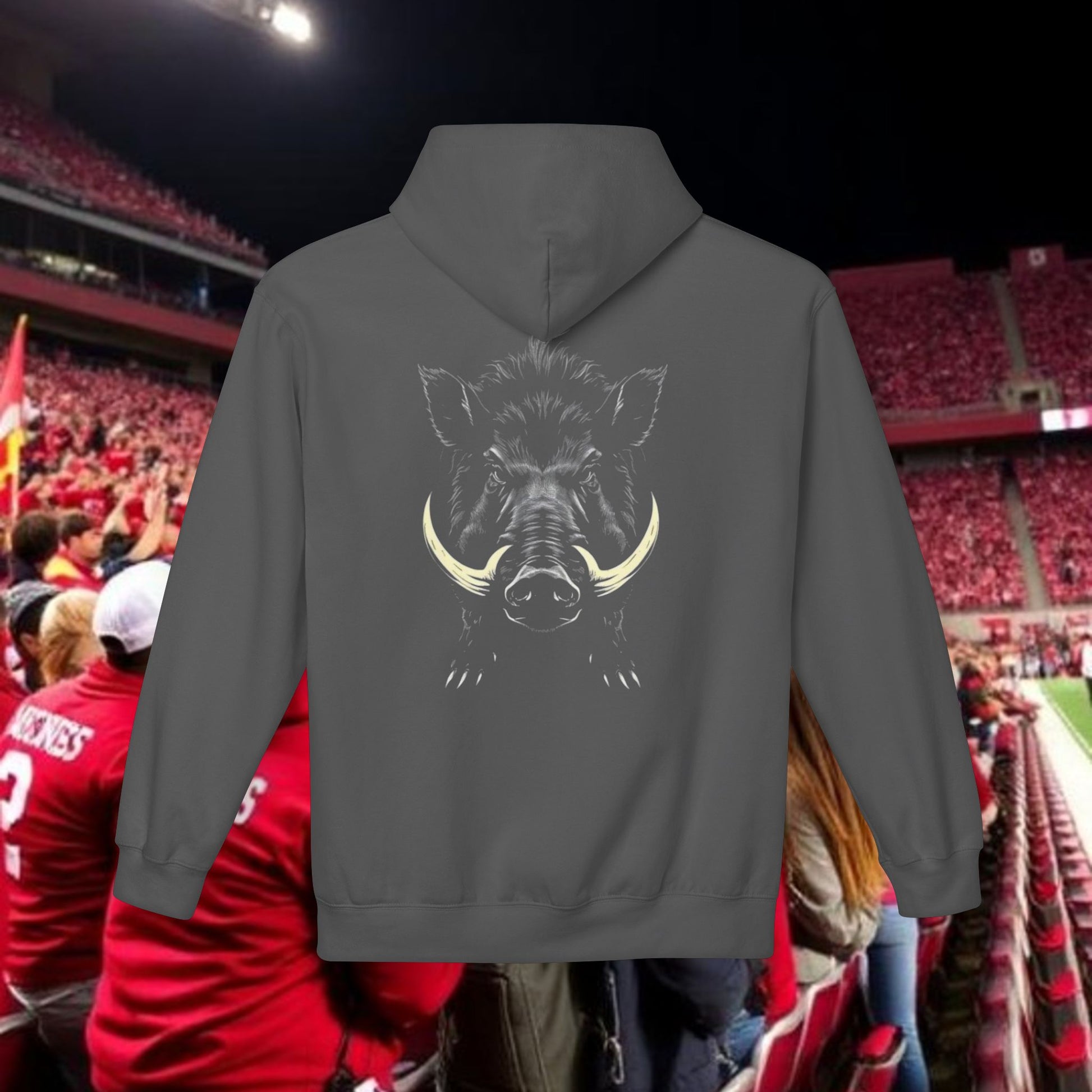 This midweight fleece hoodie channels rugged game-day energy with a bold, hand-drawn wild boar motif on the back and striking numeric detail at the chest. Built for laid-back, all-day wear, the dropped shoulders and classic fit create a relaxed silhouette that layers easily over tees. The soft, 80% ring-spun cotton face and brushed interior hold warmth without feeling bulky. Ethically produced and OEKO-TEX certified, it pairs conscience with character — reach for it when you want something that looks lived-in and purposeful, whether you’re tailgating, heading to a trailhead, or settling in at a bonfire. The pouch pocket keeps hands warm and essentials close, while the two-piece lined hood adds structure and extra protection from wind.