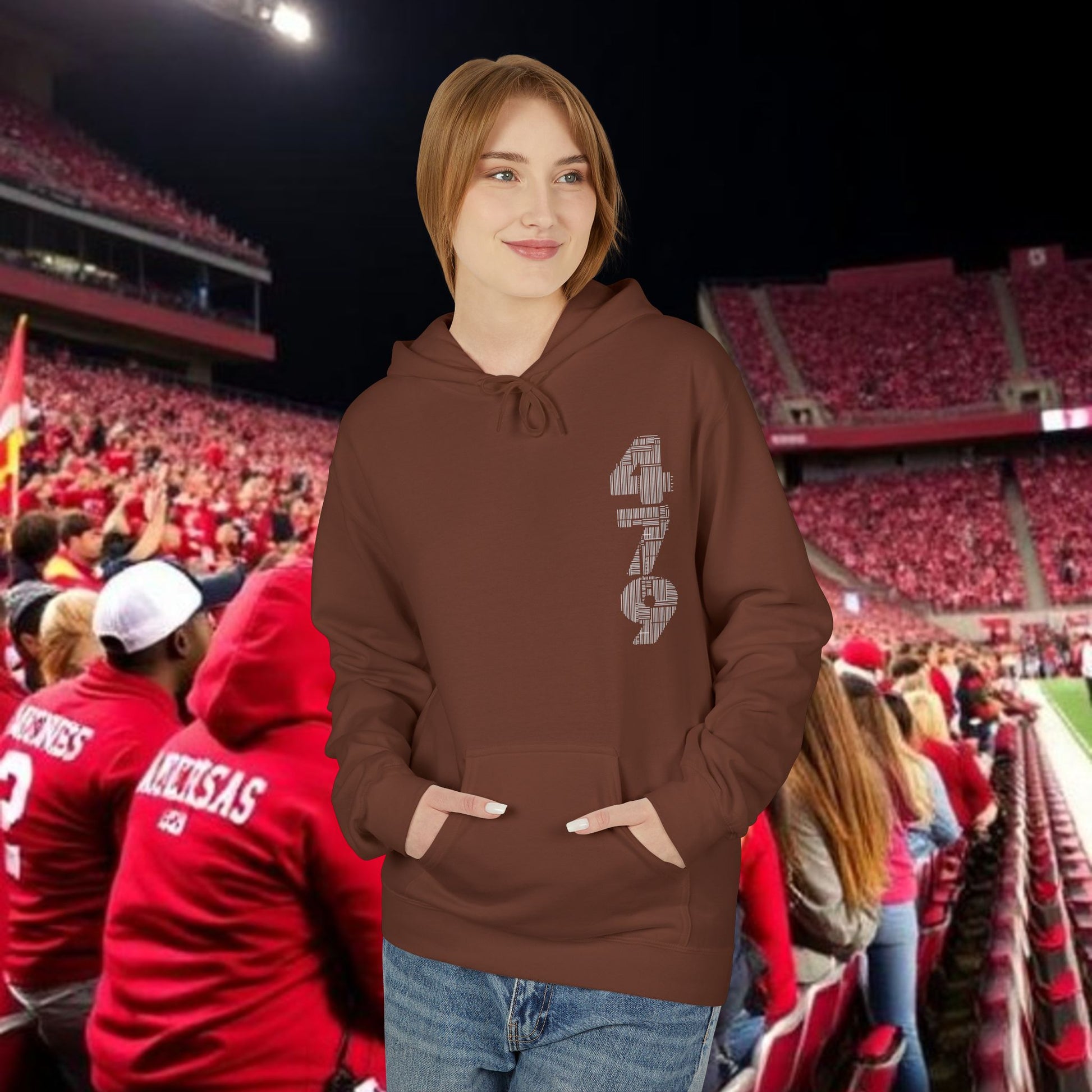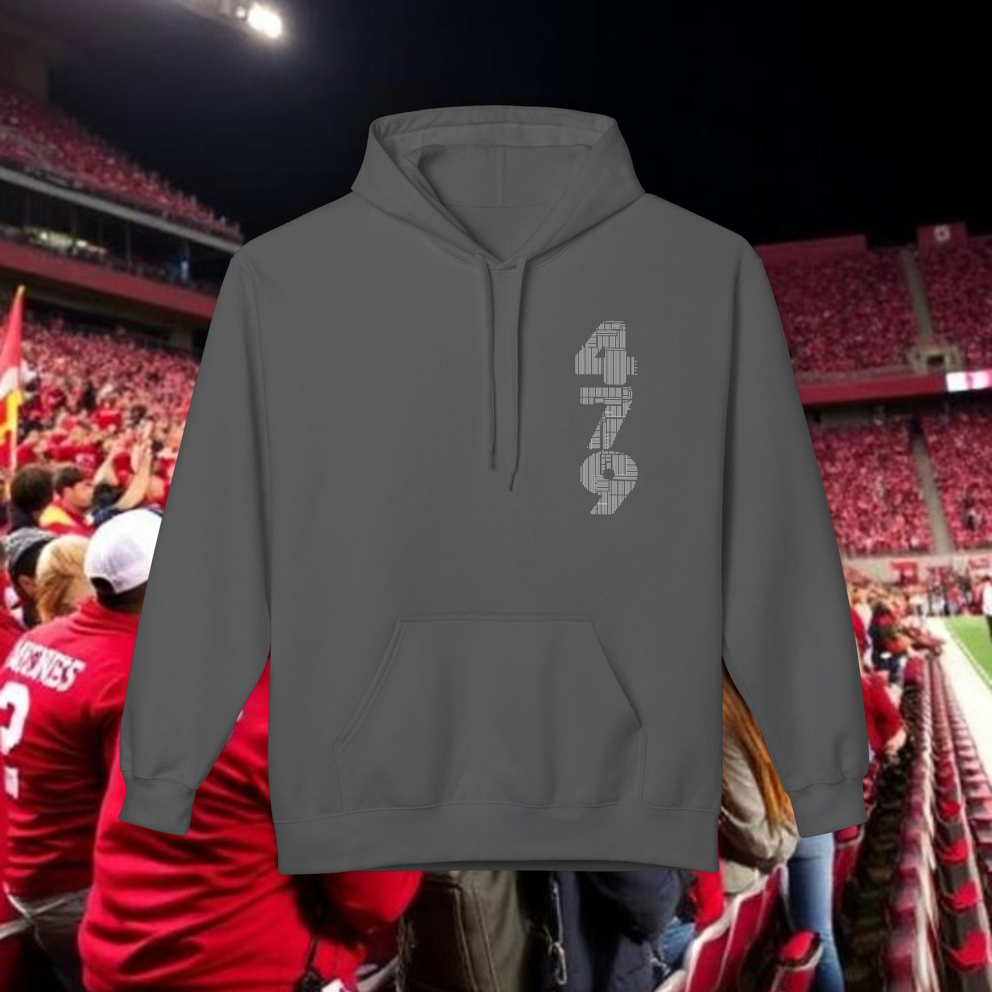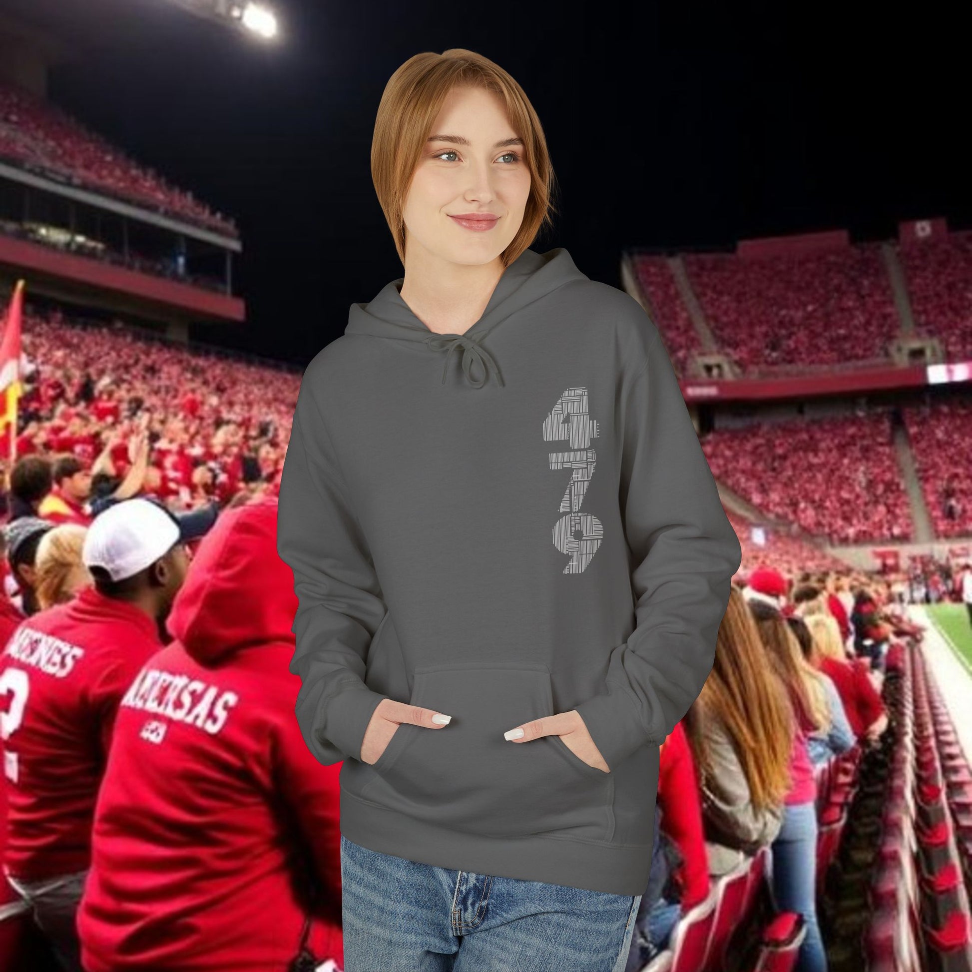 This midweight fleece hoodie channels rugged game-day energy with a bold, hand-drawn wild boar motif on the back and striking numeric detail at the chest. Built for laid-back, all-day wear, the dropped shoulders and classic fit create a relaxed silhouette that layers easily over tees. The soft, 80% ring-spun cotton face and brushed interior hold warmth without feeling bulky. Ethically produced and OEKO-TEX certified, it pairs conscience with character — reach for it when you want something that looks lived-in and purposeful, whether you’re tailgating, heading to a trailhead, or settling in at a bonfire. The pouch pocket keeps hands warm and essentials close, while the two-piece lined hood adds structure and extra protection from wind.