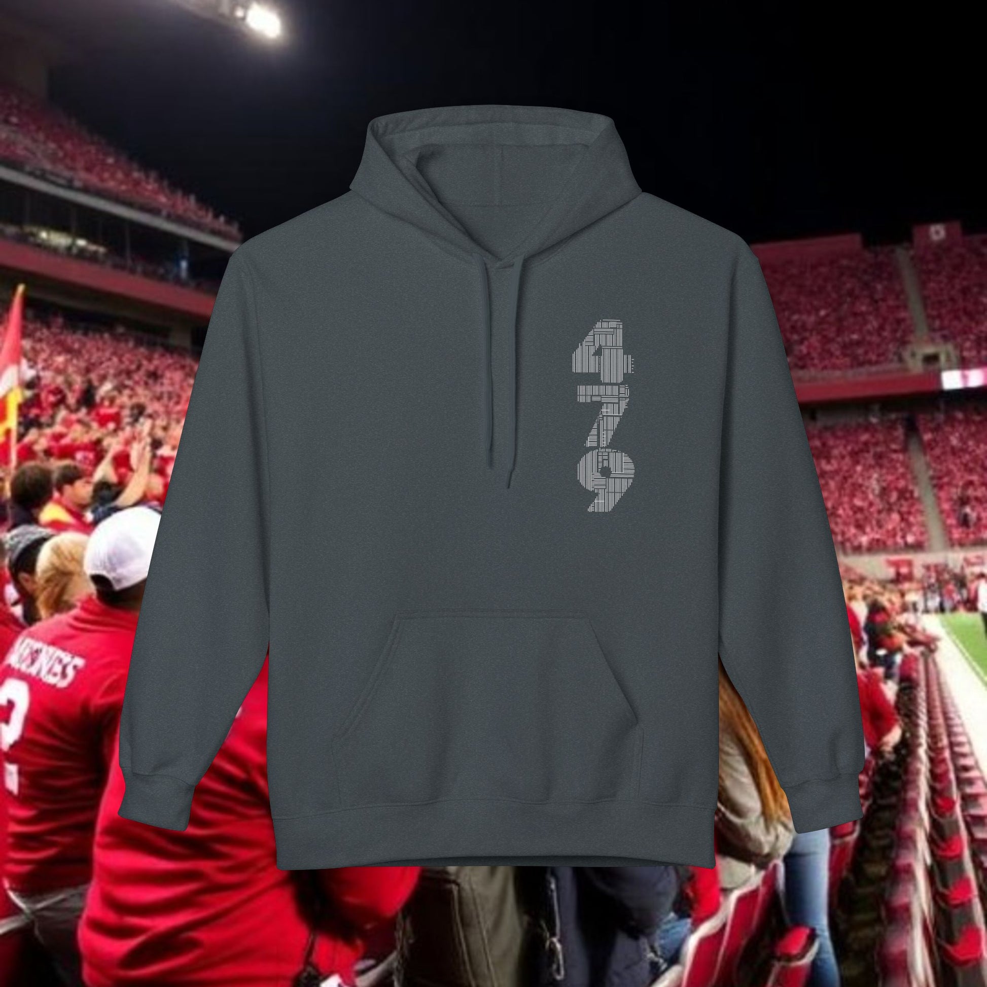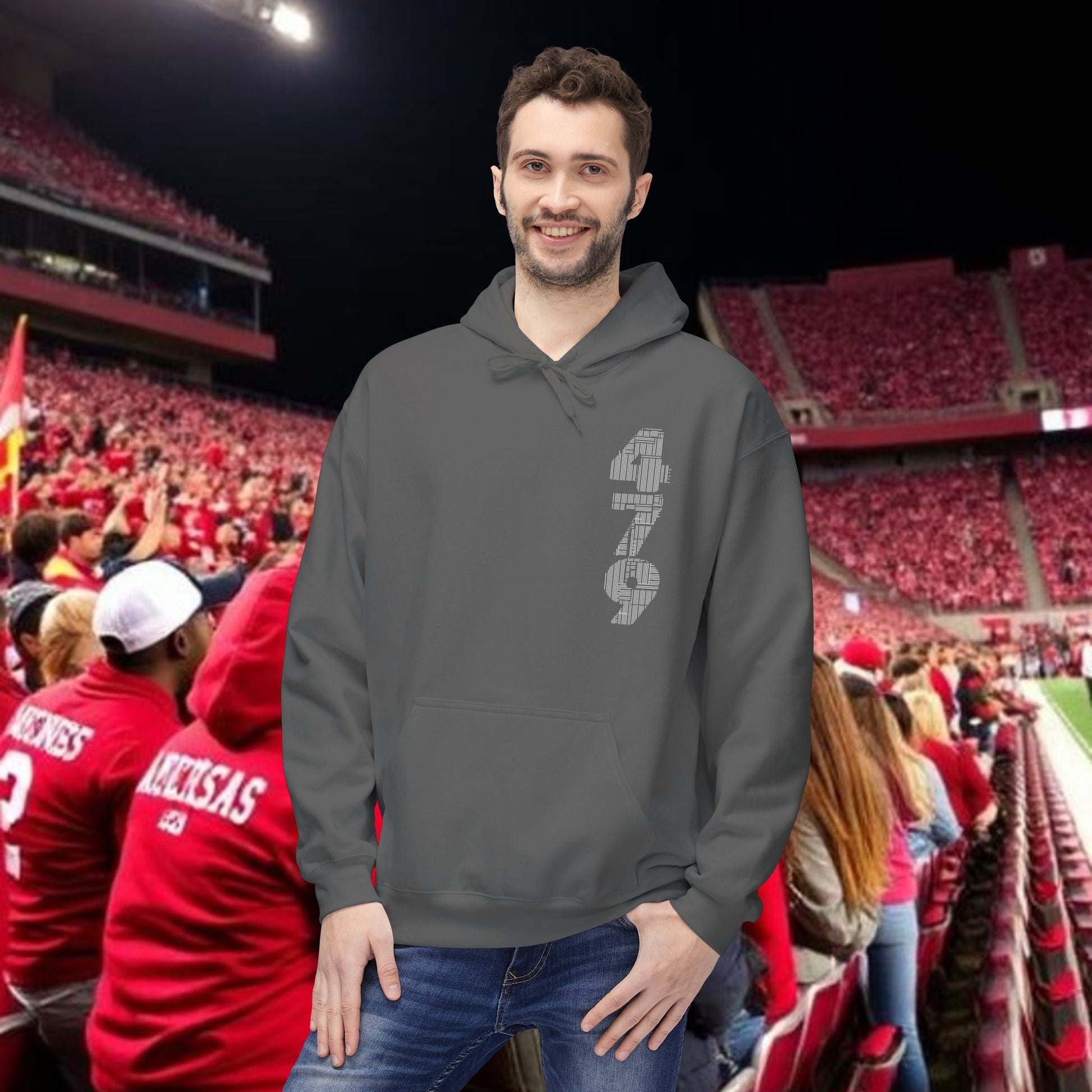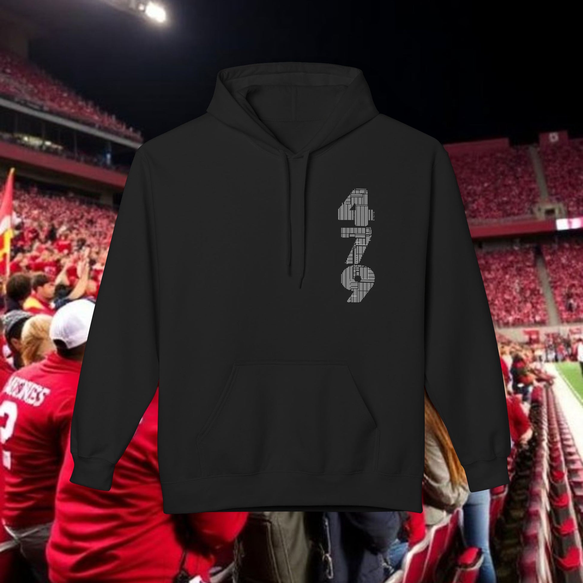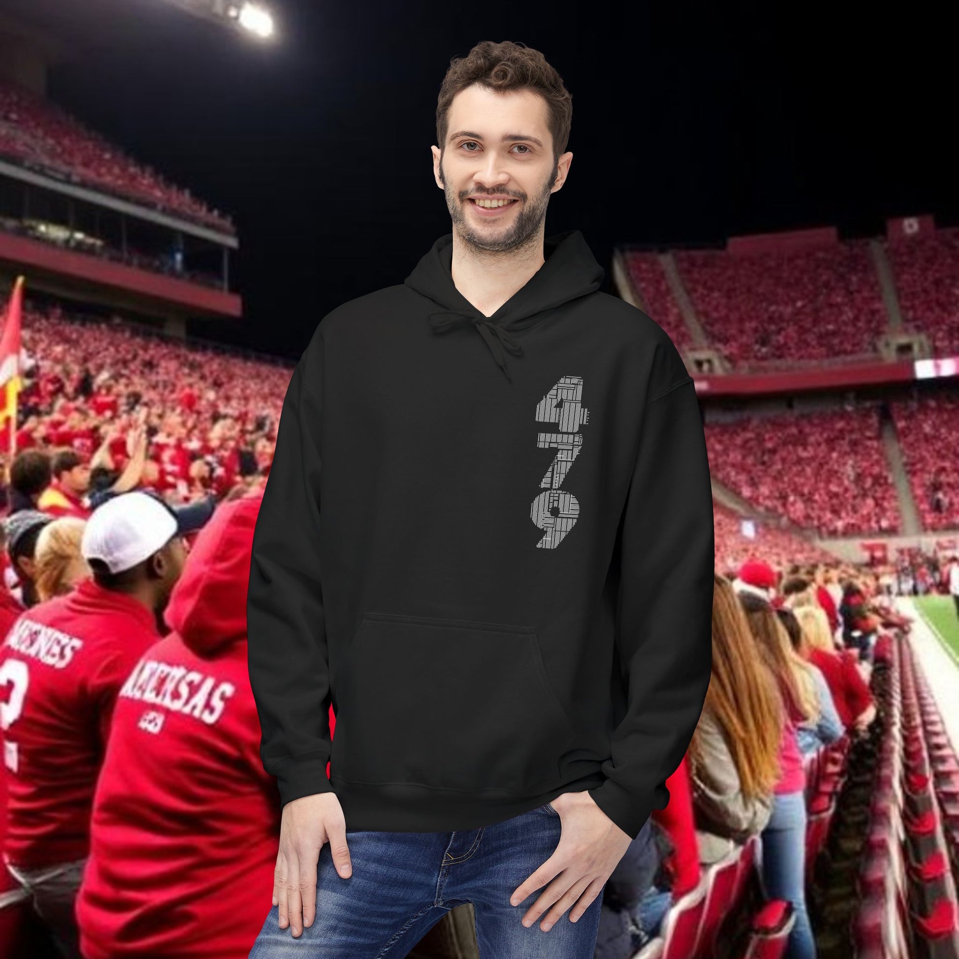 This midweight fleece hoodie channels rugged game-day energy with a bold, hand-drawn wild boar motif on the back and striking numeric detail at the chest. Built for laid-back, all-day wear, the dropped shoulders and classic fit create a relaxed silhouette that layers easily over tees. The soft, 80% ring-spun cotton face and brushed interior hold warmth without feeling bulky. Ethically produced and OEKO-TEX certified, it pairs conscience with character — reach for it when you want something that looks lived-in and purposeful, whether you’re tailgating, heading to a trailhead, or settling in at a bonfire. The pouch pocket keeps hands warm and essentials close, while the two-piece lined hood adds structure and extra protection from wind.