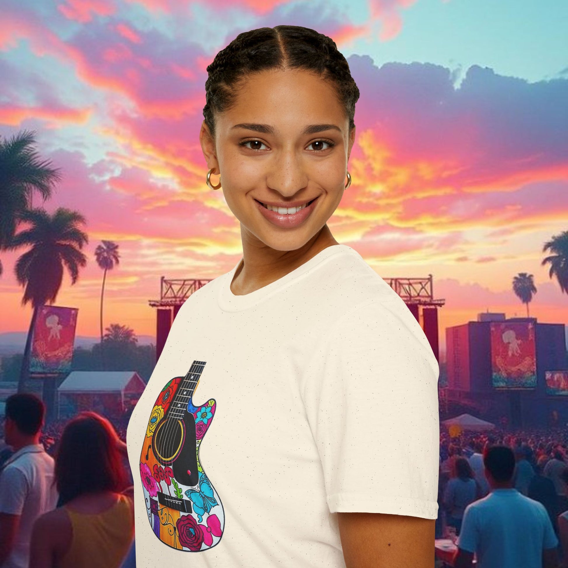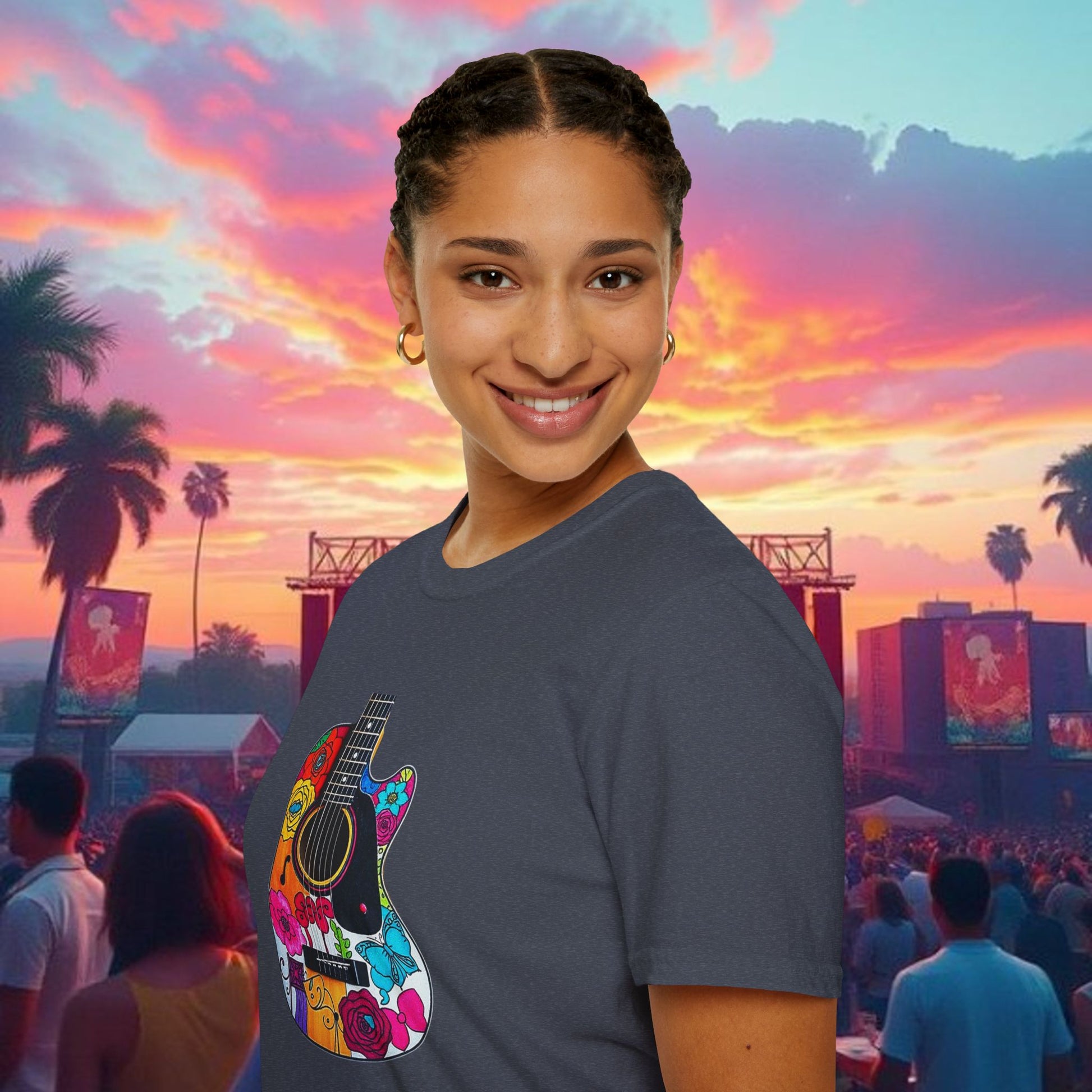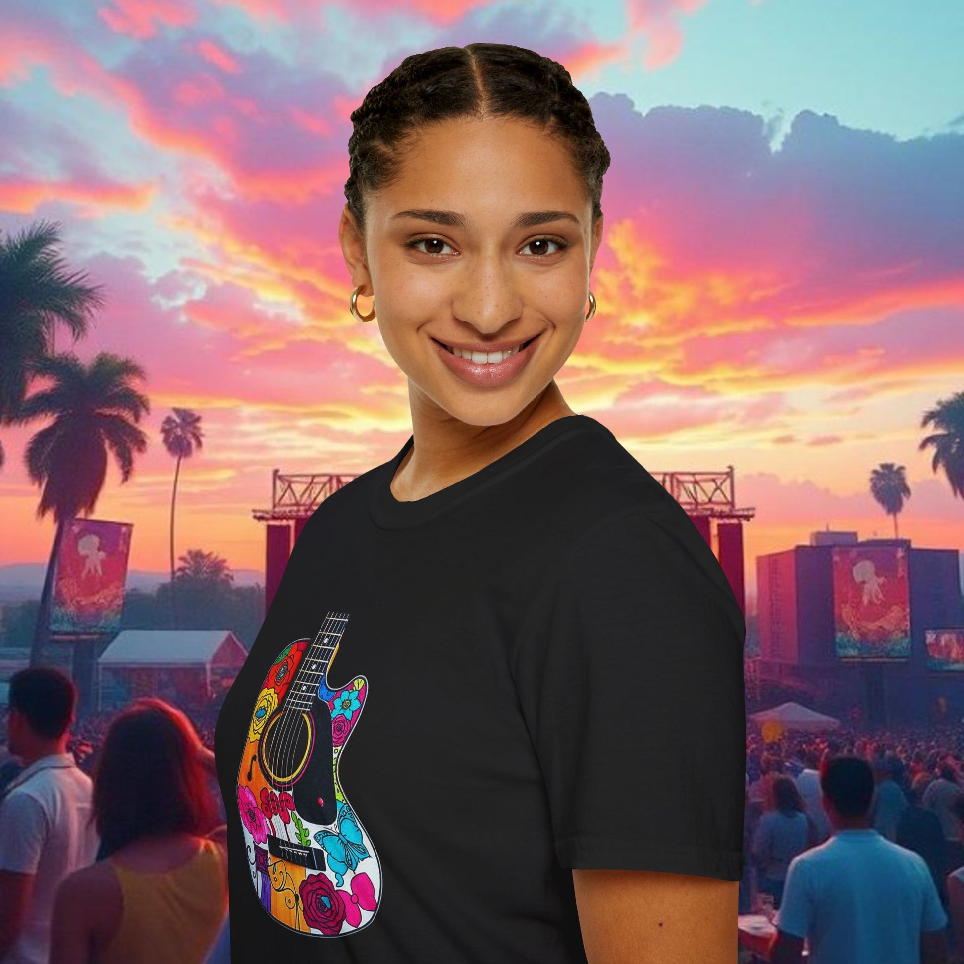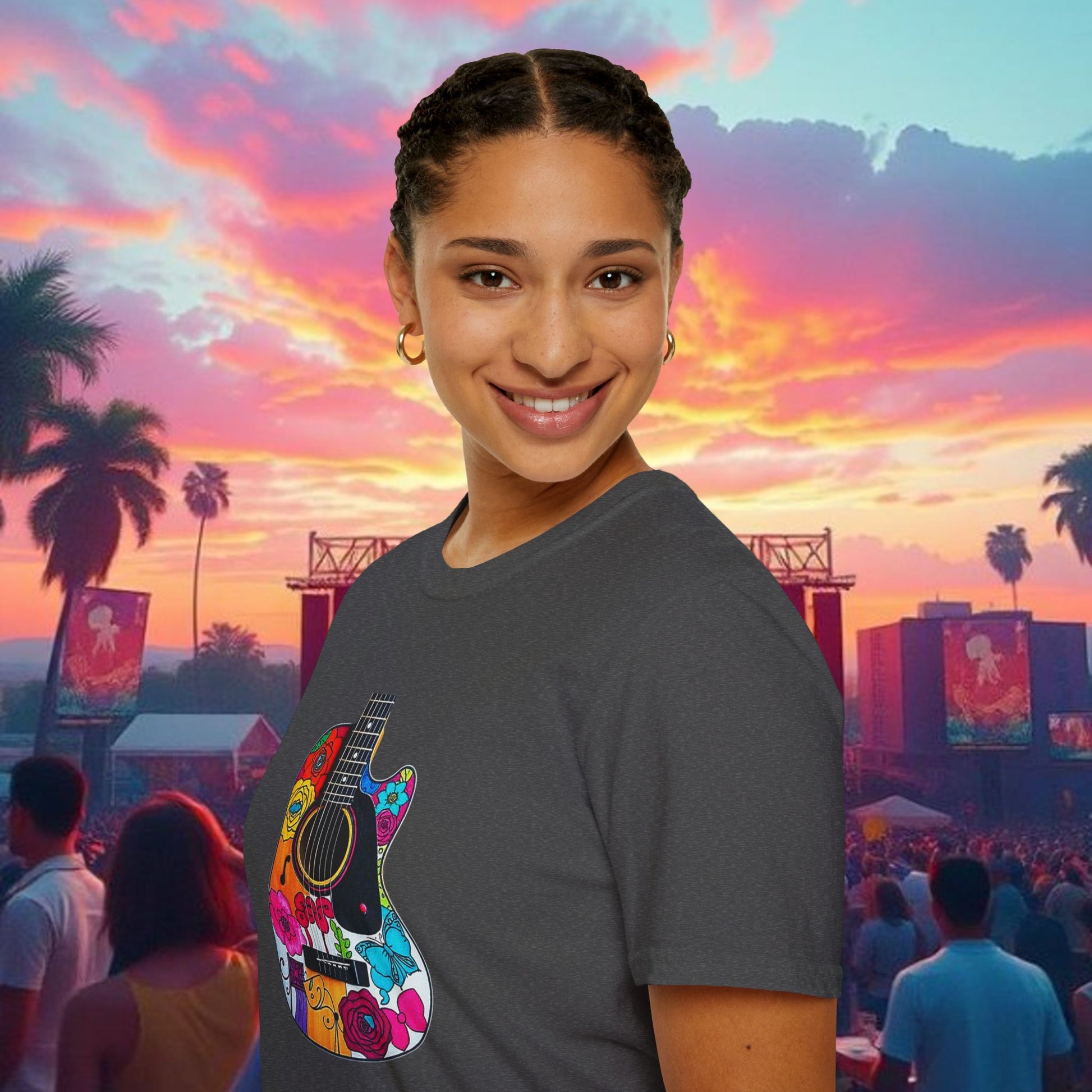 This Unisex Softstyle T-Shirt is perfect for expressing individuality and creativity. Its vibrant design, featuring a colorful guitar motif, evokes a sense of passion and joy, making it a great addition to any casual outfit. Whether you're heading to a music festival, a casual lunch with friends, or simply lounging at home, this tee will keep you comfortable and stylish. Ideal for music lovers, artists, or anyone who enjoys a unique fashion statement, this shirt also makes a thoughtful gift for birthdays, holidays, or special occasions like summer barbecues and family gatherings. Celebrate your love for music and art with this versatile and vibrant t-shirt!