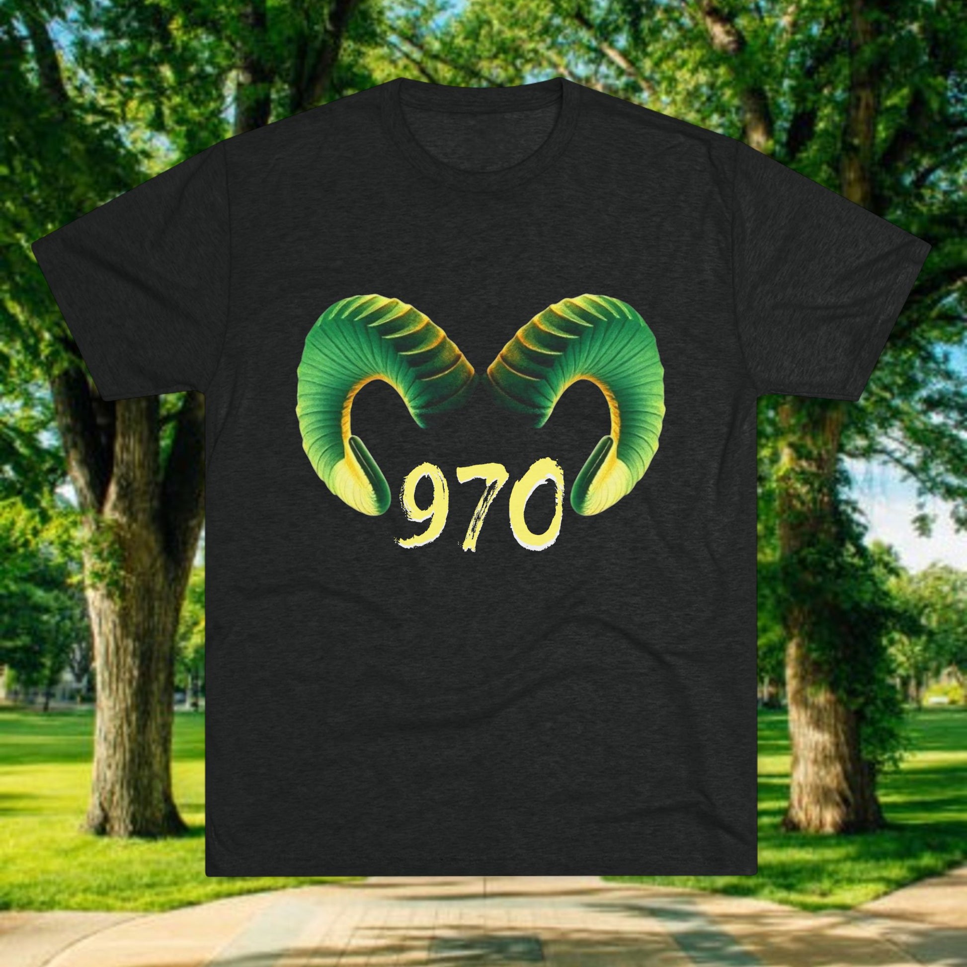 This soft tri-blend tee carries a bold, nature-driven emblem: twin ram horns in lush green arcs framing a handwritten “970”. It feels like a quiet nod to mountain roads and high-country communities — rugged yet gentle against the skin. Lightweight drape and a relaxed fit let the design breathe; wear it layered under a flannel or alone on warm evenings after a day of trailhead coffee and late sunsets. The graphic sits proudly at the chest, signaling place and pride without shouting. Comfortable enough for daily wear, it pairs with worn denim, hiking boots, or a favorite hoodie when the temperature drops.