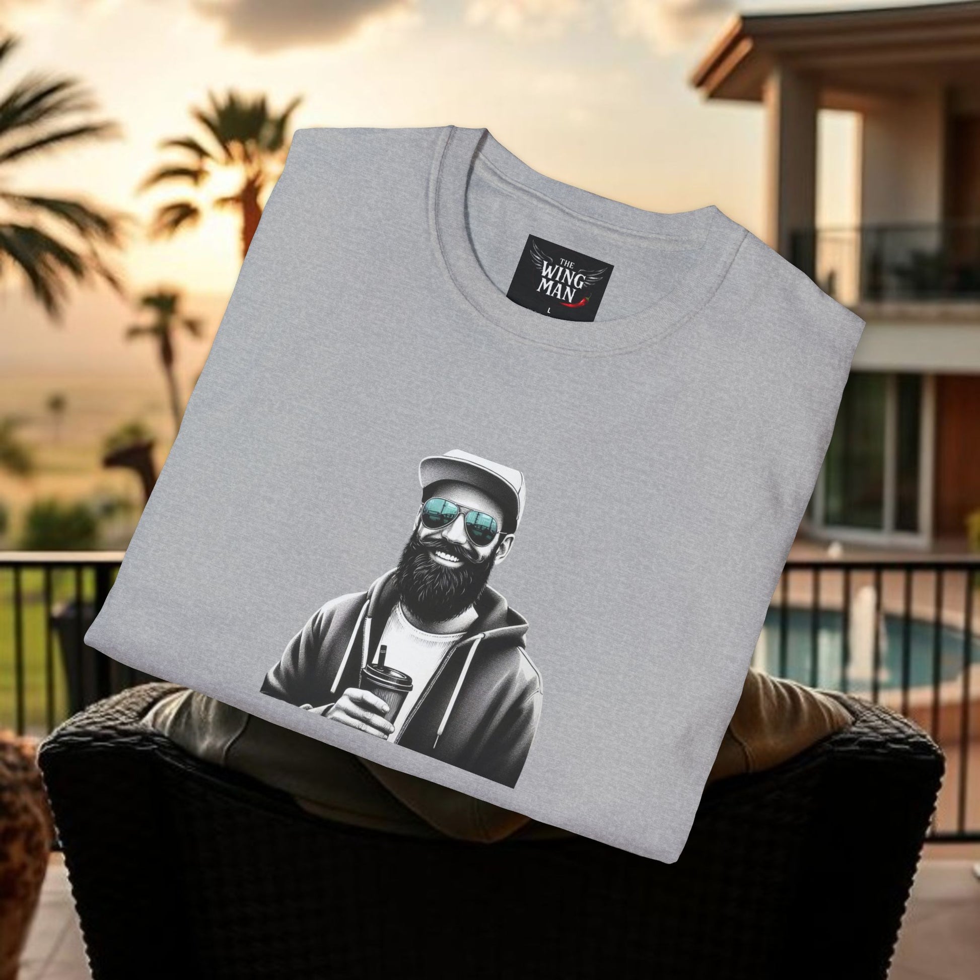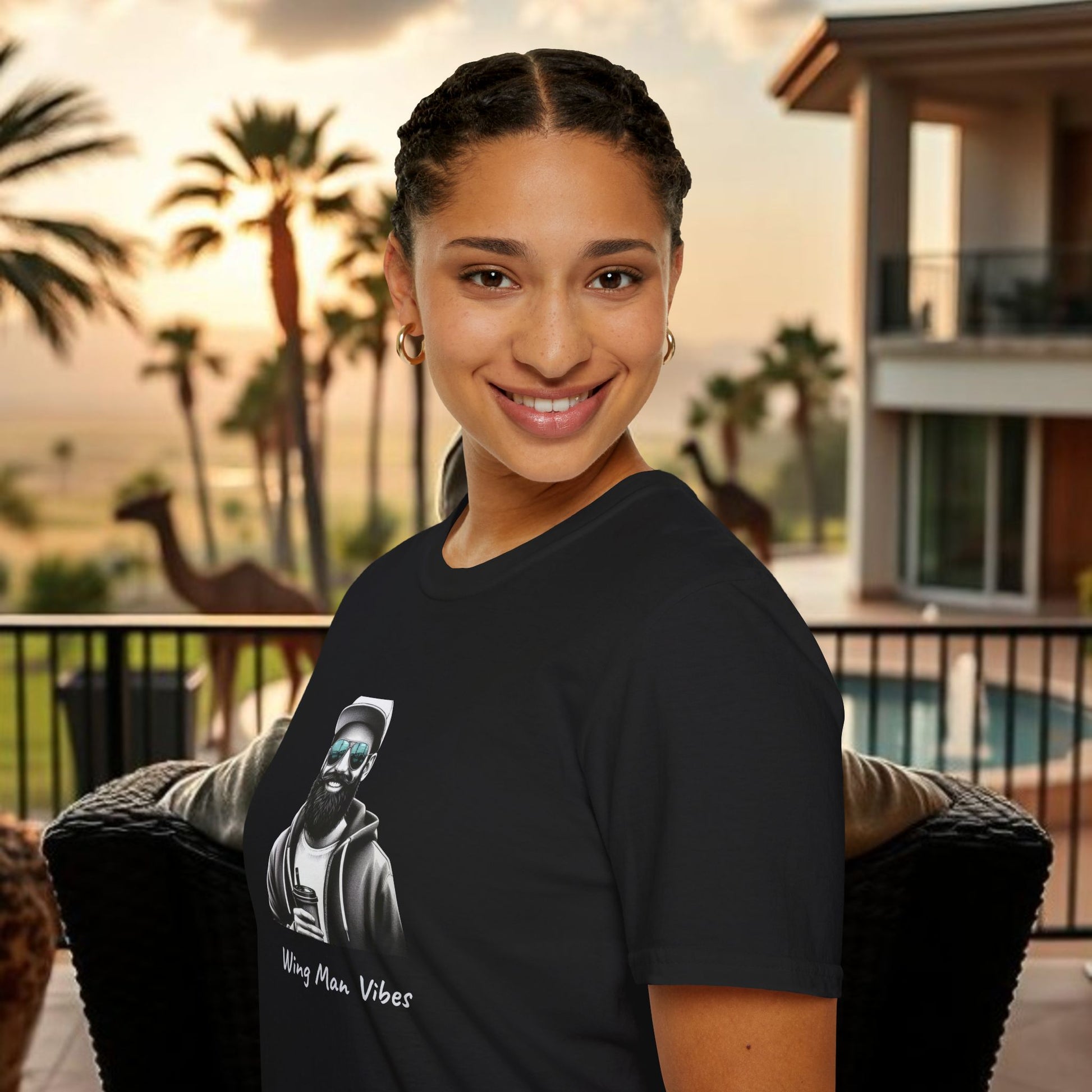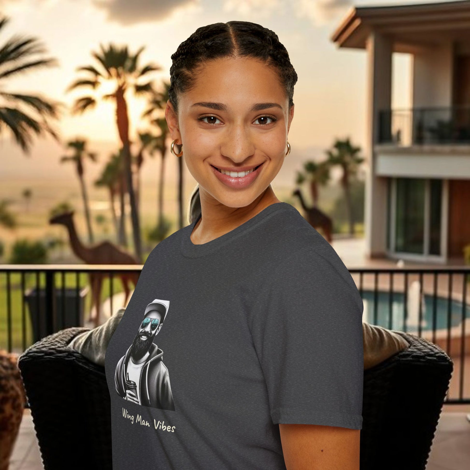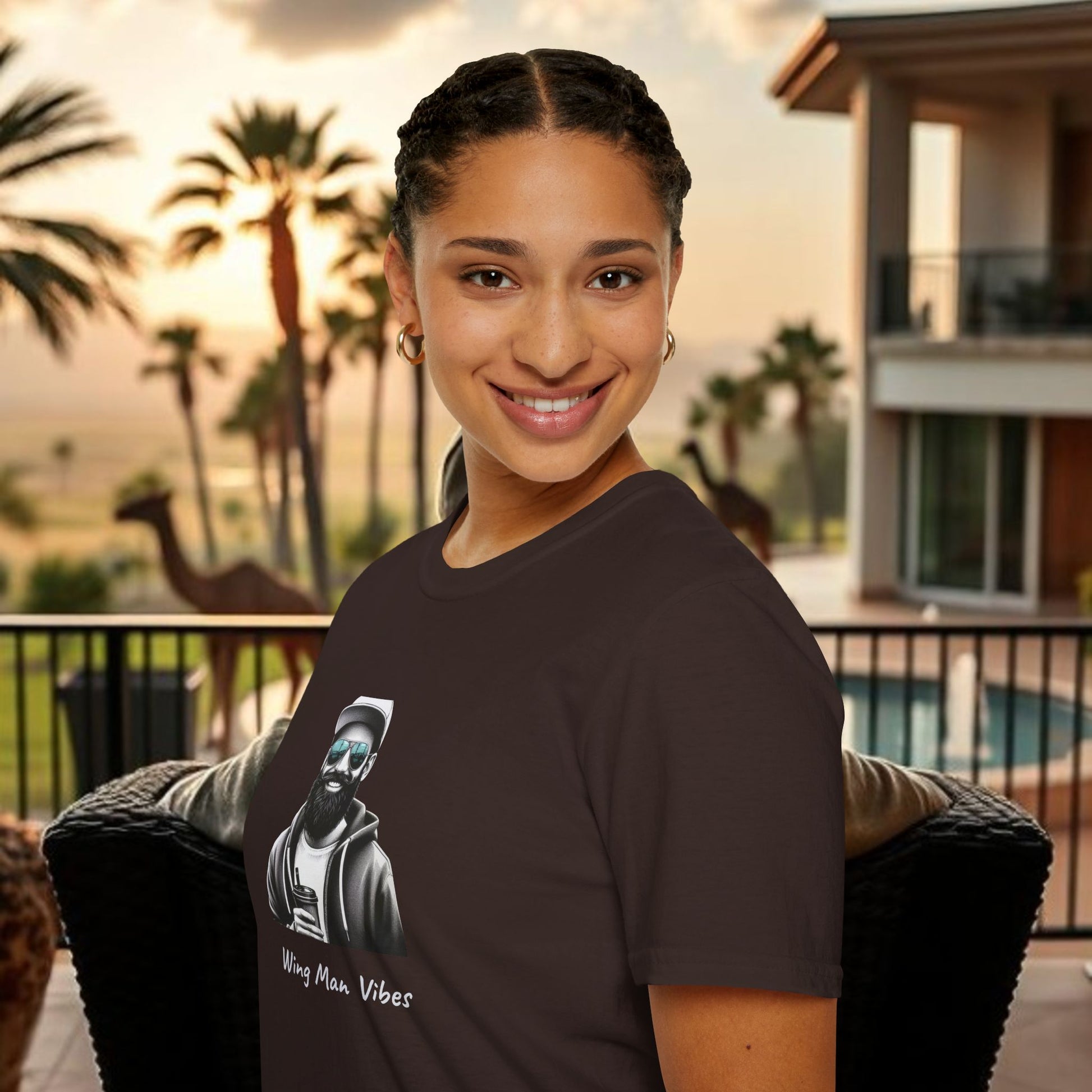 Wing Man Vibes soft style unisex tee that exudes a casual and laid-back vibe, perfect for everyday wear. Ideal for those who enjoy comfortable and versatile clothing options. Relevant for casual outings, hanging out with friends, or relaxing at home.