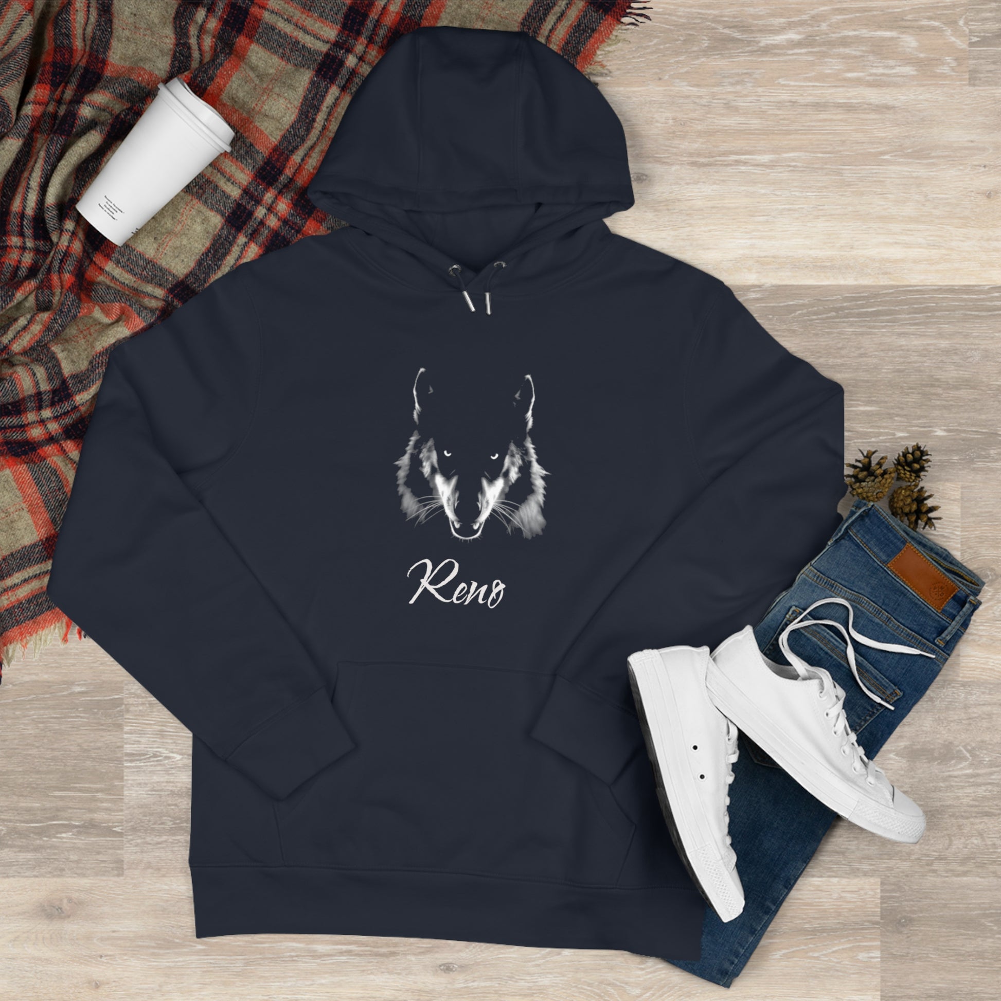A midweight hooded sweatshirt with a quietly bold spirit. The deep navy fabric feels soft against the skin and holds a detailed wolf face printed in subtle, weathered white at the chest. The sculpted hood and adjustable drawcord sit close to the neck for warmth. A roomy kangaroo pocket keeps hands tucked in and ready for slow walks, late-night fires, or quick morning coffee runs. Breathable yet substantial, this hoodie settles into regular wear — a reliable layer when you want to feel steady, grounded, and a little wild.